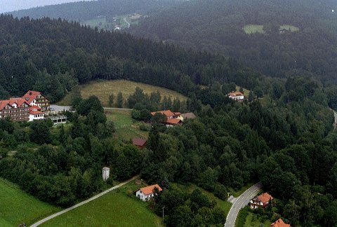 Starten Sie zu einem Rundflug um unseren Ferienhof, auf der linken Seite sehen Sie das Sporthotel Sonnenwald